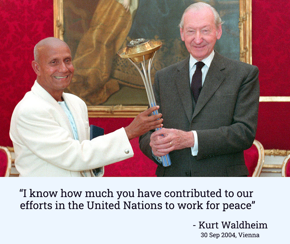 “Let me also take this opportunity to express my appreciation for your 30 years of dedication to the United Nations. Through your prayers, meditations, concerts and global ‘Peace Run', your work has linked peace-lovers in more than 100 countries and complemented that of the world Organisation….”
