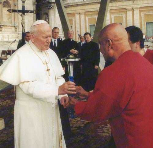 The fourth audience with Pope John Paul II took place just before the Pope's weekly Mass for 15,000 people. Sri Chinmoy offered the Pope the Peace Torch with the words.