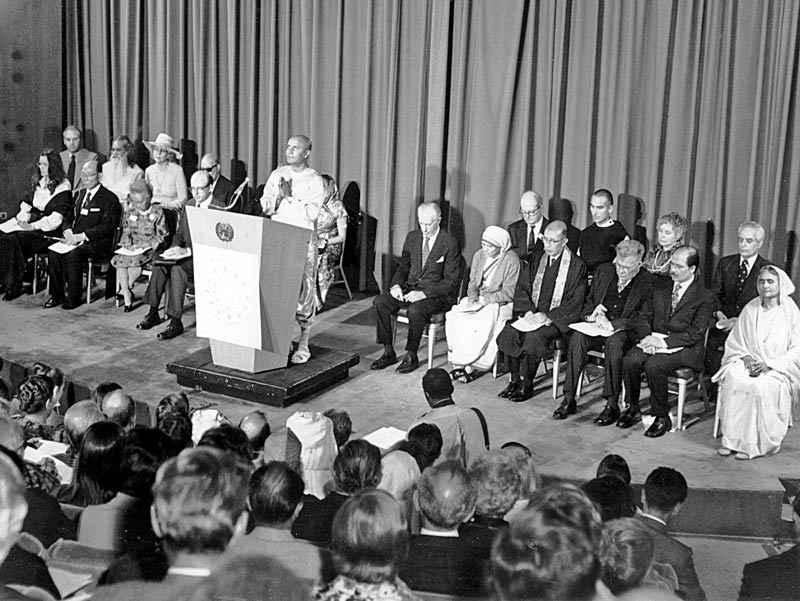 On this occasion, Sri Chinmoy offers a silent introduction to the first international interfaith conference at the United Nations, October 24th, 1975. Several prominent religious leaders attended, including Mother Teresa.