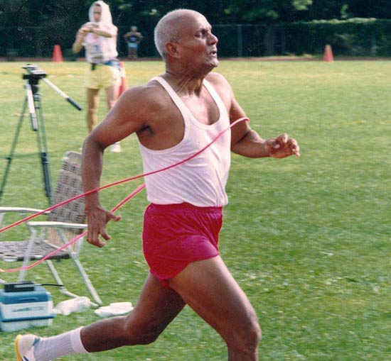 Where injuries allowed,long-distance he continued to participate in athletic meetings into his 60s and 70s. He participated in the World Masters Games in San Juan, 1983, where he ran the 400-metres in 72.66 seconds. In 1983 (at age 52), he ran the 400-metre dash in 72.66 seconds at the World Masters Games in San Juan, Puerto Rico. At age 49, he ran the 47-mile Sri Chinmoy Ultramarathon in 11:27:24 in Queens, New York. An important part of Sri Chinmoy’s philosophy was to transcend the barriers of age.